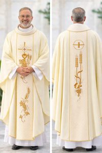 Mẫu áo lễ vàng kem thường được các linh mục mặc trong các dịp lễ trọng như Giáng Sinh và Phục Sinh…sản phẩm tại quà tặng công giáo.